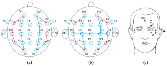 (a) Longitudinal bipolar montage for EEG signals [31], (b) transverse bipolar montage for EEG signals [31], and (c) montage of the electrodes for EOG signals [32].