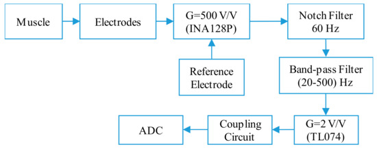 The diagram of the circuit for the acquisition of the EMG signal is shown in Figure 6. The arrangement of the electrodes for obtaining the EMG signal was made taking into account the standards of the Surface Electromyography for Noninvasive Assessment of Muscles (SENIAM) [33].