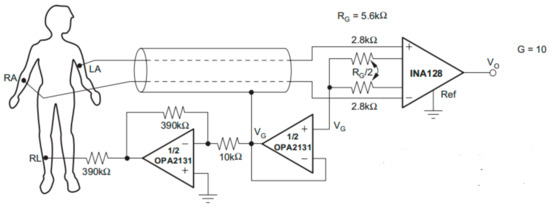 The RL electrode was used to implement a driven right leg circuit for the ECG module. This circuit is of great importance for the protection of the person and allows one to avoid unbalance currents and to compensate common-mode noise problems in the differential input of the instrumentation amplifier. Figure 8 shows the circuit and the arrangement of the electrodes for acquiring the ECG signal, using the INA128P instrumentation amplifier [34].
