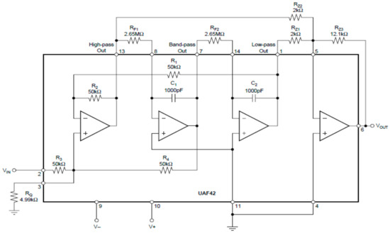 To implement the Notch filter in the ECG, EEG, EOG, and EMG modules, the integrated circuit UAF42 was used. This integrated circuit is a second-order active filter in the Sallen-Key topology, which can be configured from 6 resistors (RF1, RF2, RZ1, RZ2, RZ3, and RQ). The Notch frequency is given by