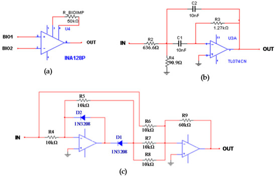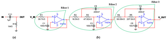 For the ECG, EEG, and EOG modules, a band-pass filter was designed, consisting of a first-order passive high-pass filter and a fifth-order active low-pass filter. For the design of the first-order high-pass filter, C11 = 1 μF and fc = 0.15 Hz were used, whereby an R10 = 1/(2 × π × C × fc) = 1 MΩ was obtained. See Figure 10a.