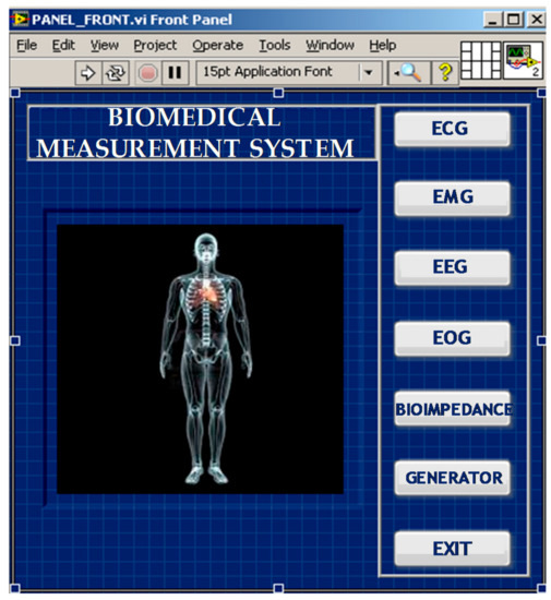 Taking into account the previous context, the design and implementation of devices for the acquisition, processing, and visualization of biomedical signals take on great relevance in the academic and research fields. A literature review shows different investigations that address the implementation of this type of device. In [27], a LabVIEW-based system of acquisition, processing, and analysis of ECG signals was presented. In [28], an ECG system was developed to monitor the heart condition of a human. The authors in [29] implemented a wearable biomedical measurement system in order to monitor the level of stress in combatants. In [30], a low cost acquisition system for the ECG, EMG, and EOG signals was developed.