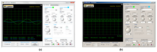 The prototype allows didactically to verify the operation of the stages that make up the modules through a set of terminals that can be seen in Figure 20a. In this way, before evaluating the performance of each module, the operation of each of the stages was verified using the NI myDAQ portable data acquisition device.