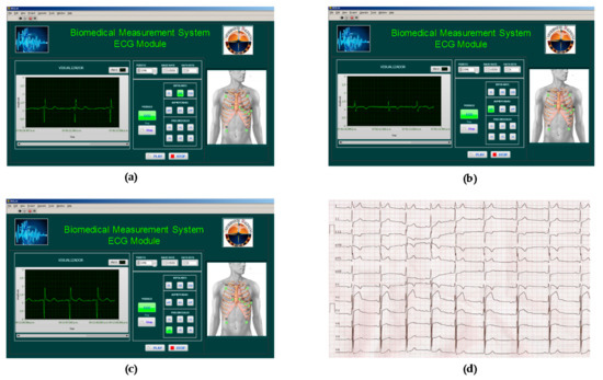 Results obtained with the ECG module. (a) Lead II, (b) Lead aVR, (c) Lead V4, and (d) ECG signals of a 30-year-old male athlete.
