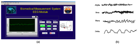 To evaluate the performance of the EEG module, a bipolar montage with the electrodes located in positions FP1 and FP2 (Frontal Pole) was performed. During the tests, the subject was awake and with normal mental activity. The results obtained for the EEG module are shown in Figure 24a. The normal rhythms obtained in electroencephalography are shown in Figure 24b, in which it can be seen that the signal obtained from the module is similar to the beta wave.