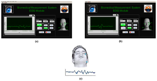 Results obtained with the EOG module. (a) Horizontal movement, (b) vertical movement, and (c) reference signal.