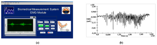 The EMG signal was acquired from the right biceps muscle. Short-term and repetitive contractions were performed. The results obtained are shown in Figure 26a. An EMG signal derived from the biceps for a subject lifting weight is shown in Figure 26b. It can be seen that this signal has a longer contraction and greater amplitude. However, it has characteristics similar to those obtained in the EMG module.