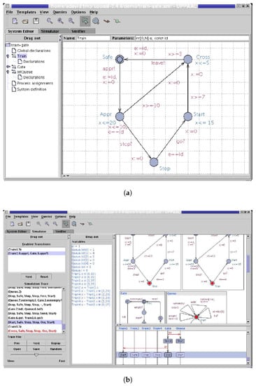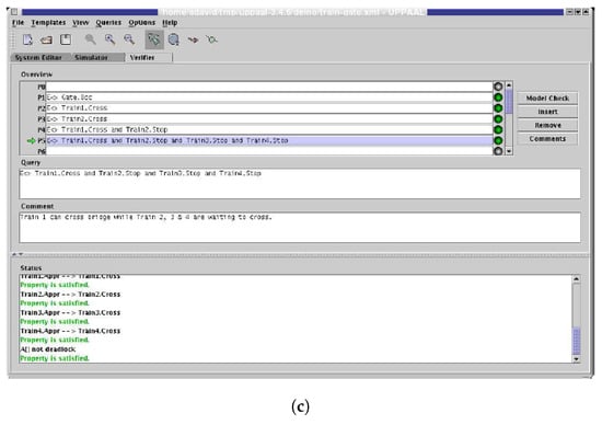 (a) View of Uppaal’s Editor screen. (b) View of Uppaal’s Simulator screen. (c) View of Uppaal’s Verifier screen. Reproduced with permission from []. Copyright Springer Nature, 2004.