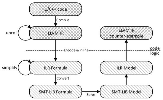 - Falke, S.; Merz, F.; Sinz, C. The bounded model checker LLBMC. In Proceedings of the 2013 28th IEEE/ACM International Conference on Automated Software Engineering (ASE), Silicon Valley, CA, USA, 11–15 November 2013; pp. 706–709. [Google Scholar]