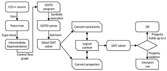 - Clarke, E.M.; Kroening, D.; Lerda, F. A Tool for Checking ANSI-C Programs. In Tools and Algorithms for the Construction and Analysis of Systems; Jensen, K., Podelski, A., Eds.; Springer: Berlin/Heidelberg, Germany, 2004; pp. 168–176. [Google Scholar]