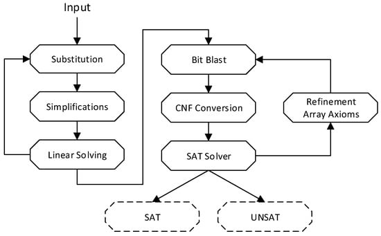 - Ganesh, V.; Dill, D.L. A Decision Procedure for Bit-Vectors and Arrays. In Computer Aided Verification; Damm, W., Hermanns, H., Eds.; Springer: Berlin/Heidelberg, Germany, 2007; pp. 519–531. [Google Scholar]
