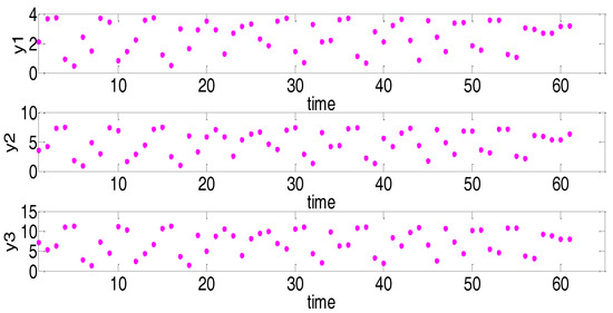 From the above inferences, we have introduced a hyperchaotic Henon Map with a variable amplitude and DC levels. With six configurable parameters, we can arbitrarily adjust the generation of random numbers to increase the complexity of random numbers. In the following, we show the simulation analysis. When we give the modulation parameters a 1 = 1 , a 2 = 2 , a 3 = 3 , d 1 = 2 , d 2 = 4 , d 3 = 6 . The simulation results are shown in Figure 2 and Figure 3.