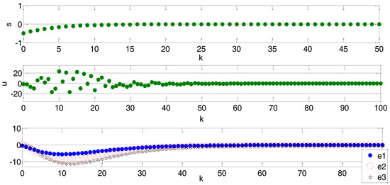 From Equation (11), we can see that if we choose c 1 , c 2 such that the eigenvalues of M in Equation (11) can be limited in the unit circle, i.e., | λ i ( M ) | < 1 , then e 2 , e 3 can converge to zero. Furthermore, according to e 1 ( k ) = c 1 e 2 ( k ) c 2 e 3 ( k ) , we obtain e 1 = 0 when e 2 , e 3 have converged to zero.