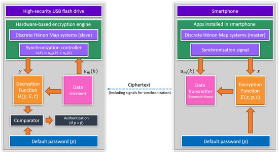 where E ( x , p , t ) is a non-linear encryption function, D ( y , E , t ) is a non-linear decryption function, p is the key (default built, not user-defined), p ^ is the recovered key, x is the random state of master chaotic system in the smartphone, y is the random state of slave chaotic system built in USB flash drive. The complete authentication mechanism is shown in Figure 7.