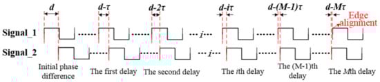The phase difference between two periodic signals with the same frequency can be calculated by time difference. Progressive phase shift (PPS) utilizes delay accumulation to quantify the time difference, as shown in Figure 1. In the figure, d is the phase difference between Signal_1 and Signal_2. The rising edges of the two signals are detected by the phase detection circuit. When the signals are not aligned, Signal_1 is delayed by τ until edge alignment of the two signals is detected. If the edge alignment is detected after m delays of τ have been performed. Then the measurement result of the phase difference can be obtained from the Equation (1).