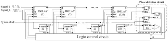 Then, two measurements should be performed to obtain Δt1 and Δt2. The logic control circuit calculates Δtj (j = 1, 2) according to Equation (11), where λ1 and λ2 represent the the initial state of the D flip-flops and the phase detection result, respectively. In Equation (11), M is the number of PDLs Signal_1 has passed through, m is the number of active taps in the Mth IDELAY, ci is the number of taps in the first M-1 IDELAYs, and T is the period of the measured signal.
