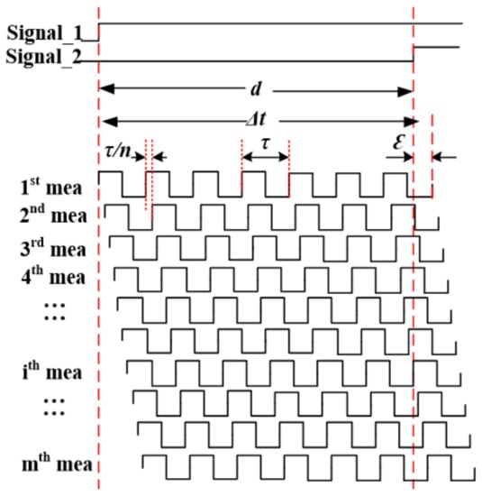 To improve the resolution, a modified method is introduced, which conducts multiple measurements. The timing diagram of the modified method is shown in Figure 4. The first measurement is carried out using the method described above. The second measurement is performed after Signal_1 has been delayed by τ/n, which means the phase difference is decreased by τ/n. Similarly, the third measurement is performed after Signal_1 has been delayed by 2τ/n. Measurements are performed n times in total. Therefore, the measurement result and measurement error can be calculated from Equations (3) and (4), where Δti and εi represents the measurement result and measurement error of the ith time, respectively, and εi satisfies 0 ≤ εi < τ. The first measurement error is marked as ε1, and the second measurement error ε2 can be calculated from (4). In (4), represents a real remainder operation and the return value is the remainder of x/y. Hence, it can be concluded that the measurement error εi can be calculated from (5), and the measurement error ε can be calculated from (6)–(8).