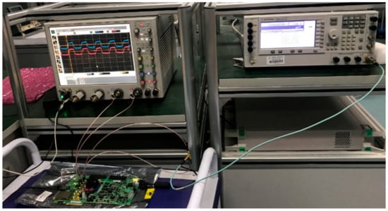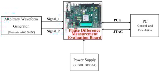 The test bench of the proposed phase difference measurement system is shown in Figure 5. An arbitrary waveform generator (Tektronix AWG 5012C) is employed to generate the phase difference signals, and the phase difference signal is input through the SMA connector, which has the advantage of low noise and impedance. The power of the board is supplied by DC power supply RIGOL DP832A.