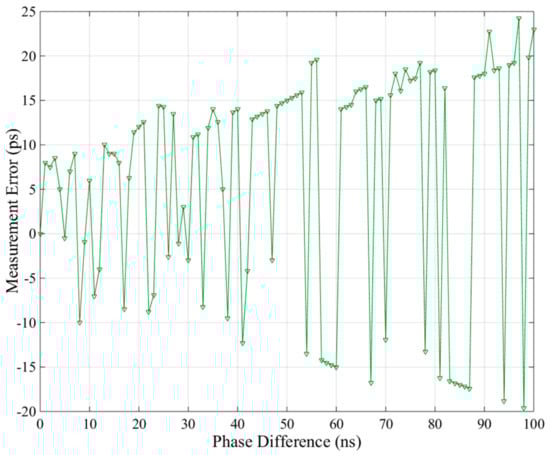 Experiments are conducted to evaluate the performance of the proposed phase difference measurement system based on double PPS. In the experiments, phase differences differing by 1 ns in the range of 0 ns~100 ns are produced. Figure 6 shows the measurement error. In the figure, the largest measurement error is 24.5 ps, and all the measurement errors are less than 25 ps. The measurement error presents a slight increase with the increase in the phase difference, which we think is caused by the phase difference generator.