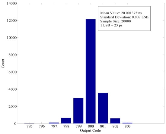 Experiments are also conducted to evaluate the measurement stability of the realized phase difference measurement system. The phase difference signal with a constant phase difference of 20 ns is measured for 20,000 times. The distributions of measurement results are shown in Figure 7. The standard deviations are 0.802 LSB (1 LSB = 25 ps). In the equation, ϭ is the standard deviation, Xi is the measurement result of the ith time, and N is the measurement time.