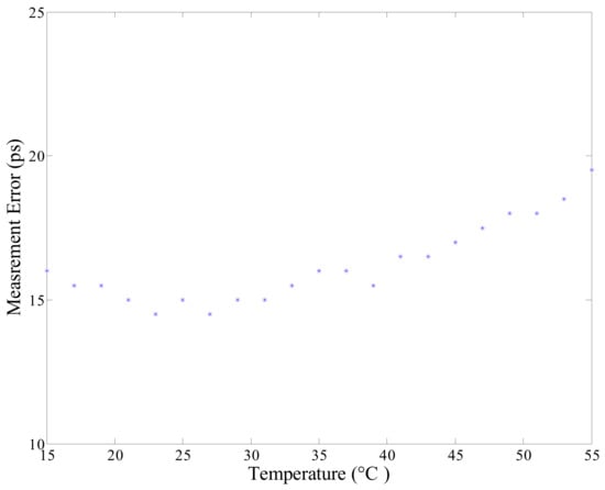 The temperature stability of the proposed phase difference measurement system is tested on the evaluation board. The temperature tests are performed with the use of a thermal chamber. A constant phase difference (5 ns) is measured under different temperature, with a range of 15 °C~55 °C. Measurement under a temperature is repeated 50 times. The measurement error (mean of absolute value) under different temperature is shown in Figure 8. In the figure, the largest variation in the measurement result is 5 ps.