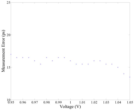 The voltage tests are performed using the DC power supply RIGOL DP832A. The nominal operating voltage of the evaluation board is 1 V (internal supply voltage of FPGA). In the tests, the supply voltage of the FPGA is changed within the range of 0.95 V~1.05 V with a step of 5 mV. A constant phase difference (5 ns) is measured under different supply voltages at an ambient temperature of approximately 25 °C. Each measurement at a given voltage is also repeated 50 times. The measurement error is shown in Figure 9, which indicates that with the change in supply voltage, the largest difference in the measurement error is less than 3.5 ps.