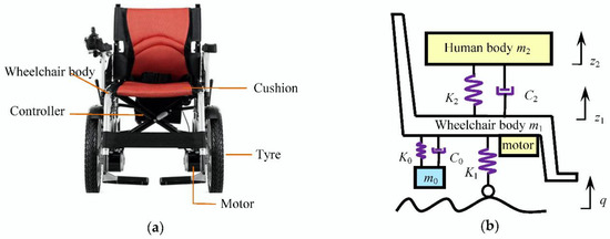 A commercially available electric wheelchair is shown in Figure 1a. According to the electric wheelchair, a simplified vibration model of the human-wheelchair system with the DA was created, as shown in Figure 1b where the motor is fixed on the wheelchair body; m2, m1, and m0 are the human body mass, the wheelchair body mass (including the motor mass), and the DA mass, respectively; C2 and C0 are the damping coefficients of the cushion and the DA, respectively; K2, K1, and K0 are stiffness coefficients of the cushion, the tire system, and the DA, respectively; z2, z1, and z0 are the corresponding displacements; and q is the road excitation.