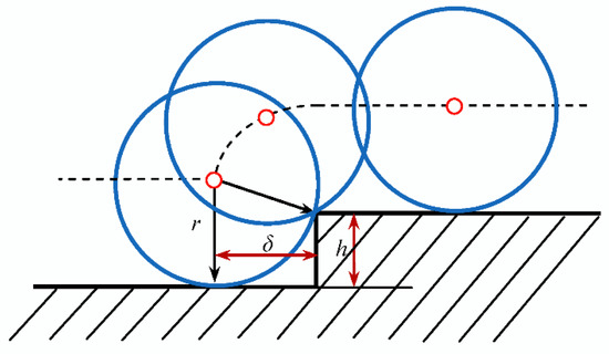 When a wheelchair goes up a step or goes down a step, the displacement excitation is not exactly the same as the step shape. The tire has a correction to the step–road surface. Figure 2 depicts the rolling condition of the tire passing the step without leaving the road surface. In Figure 2, the dotted line is the trajectory of the tire center; r is the static radius of the tire; h is the height of the step; and δ is the horizontal distance of the tire center to the step.
