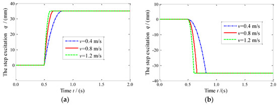 For example, r = 250 mm for a wheelchair, h = 35 mm, and v = 0.4, 0.8, and 1.2 m/s. Figure 3a,b depicts the time histories of the step excitation q for the wheelchair going up the step and going down the step, respectively. It can be seen that the greater the running speed v, the more sharply the excitation changes.