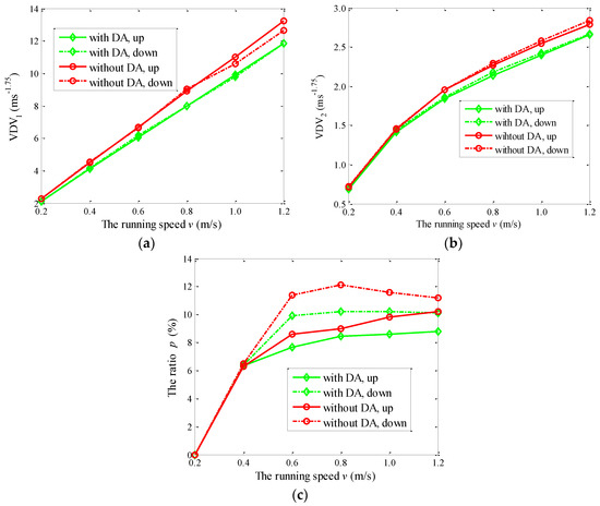 As shown in Figure 5a, VDV1 increases linearly with the increase of the running speed v. The curves of VDV1 versus v are almost the same for the wheelchair going up and going down the step. Compared with the wheelchair without the DA, the VDV1 of the wheelchair with the DA is reduced by 11.2%. Figure 5b shows that VDV2 increases nonlinearly with the increase of the running speed v. The VDV2 values of the wheelchair going down the step are slightly larger than those of the wheelchair going up the step. Compared with the wheelchair without the DA, the VDV2 of the wheelchair with the DA is reduced by 11.3%. As shown in Figure 5c, p increases rapidly with the increase of the running speed v at the beginning. When v >0.8 m/s, p hardly increases. From v = 0.0 m/s to v = 0.4 m/s, the DA system has little effect on p. When v = 0.8 m/s, the improvement of p is up to 16.7%. In addition, the curves of p versus v are almost the same from v = 0.0 m/s to v = 0.4 m/s for the wheelchair going up and going down the step. When v >0.4 m/s, the p value of the wheelchair going down the step is obviously larger than that of the wheelchair going up the step.