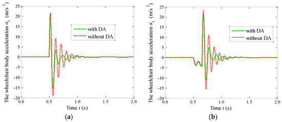A comparison of the time histories of the wheelchair body acceleration a1 for the system with the DA and without the DA: (a) going up the step; (b) going down the step.