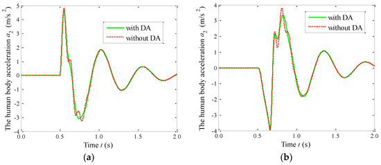 A comparison of the time histories of the human body acceleration a2 for the system with the DA and without the DA: (a) going up the step; (b) going down the step.