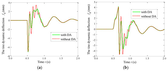 A comparison of the time histories of the tire dynamic deflection fd for the system with the DA and without the DA: (a) going up the step; (b) going down the step.