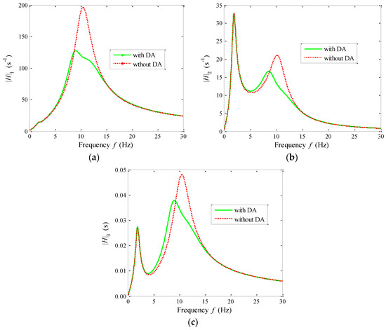 Only analyzing the time domain responses is not enough to fully reveal the differences of the system with the DA and without the DA. The amplitude frequency characteristics of the system should be analyzed. In this section, based on the parameters in Table 1, the curves of |H1|, |H2|, and |H3| versus the excitation frequency f were plotted, as shown in Figure 9.