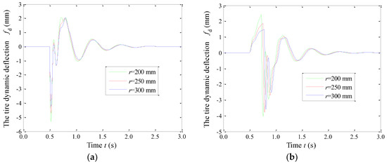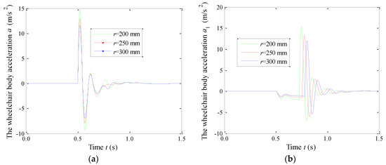 To reveal the influences of the tire static radius r on the vibration behaviors, the impact responses were numerically simulated for r = 200 mm, 250 mm, and 300 mm, respectively. The used parameters of the human-wheelchair system with the DA are in Table 4. The simulation condition is set as: h = 35 mm, v = 0.5 m/s. The simulation step is set as = 0.001 s. The calculated results of the vibration responses were given in Table 5. The comparisons of the time histories of the wheelchair body acceleration a1, the human body acceleration a2, and the tire dynamic deflection fd at different values of r are shown in Figure 10, Figure 11 and Figure 12, respectively