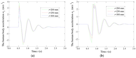 A comparison of the time histories of the human body acceleration a2 at different values of r for the wheelchair: (a) going up the step; (b) going down the step.