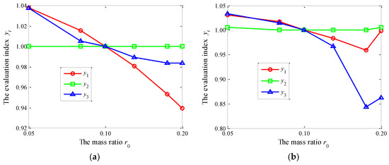 The evaluation index yi versus the mass ratio r0 for the wheelchair: (a) going up the step; (b) going down the step.