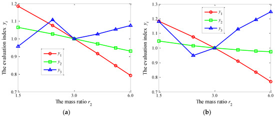 The evaluation index yi versus the mass ratio r2 for the wheelchair: (a) going up the step; (b) going down the step.