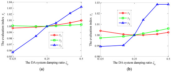 The evaluation index yi versus the DA system damping ratio ξ0 for the wheelchair: (a) going up the step; (b) going down the step.