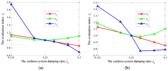 The evaluation index yi versus the cushion system damping ratio ξ2 for the wheelchair: (a) going up the step; (b) going down the step.