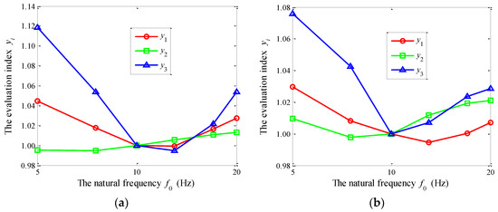 The evaluation index yi versus the natural frequency f0 for the wheelchair: (a) going up the step; (b) going down the step.