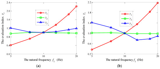 The evaluation index yi versus the natural frequency f1 for the wheelchair: (a) going up the step; (b) going down the step.
