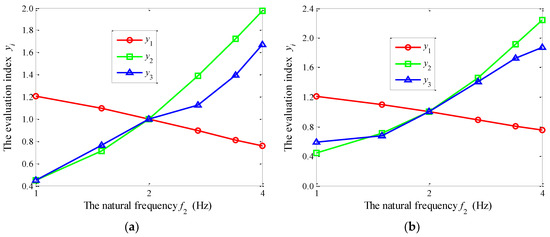 The evaluation index yi versus the natural frequency f2 for the wheelchair: (a) going up the step; (b) going down the step.