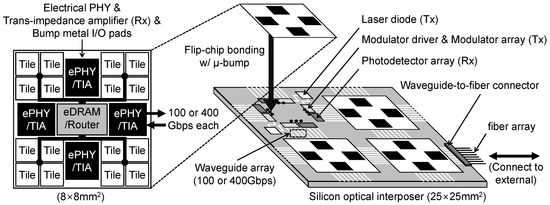 - Okamoto, D.; Urino, Y.; Akagawa, T.; Akiyama, S.; Baba, T.; Usuki, T.; Miura, M.; Fujikata, J.; Shimizu, T.; Okano, M.; et al. Demonstration of 25-Gbps optical data links on silicon optical interposer using FPGA transceiver. In Proceedings of the European Conference on Optical Communications (ECOC), Cannes, France, 21–25 September 2014. [Google Scholar]
