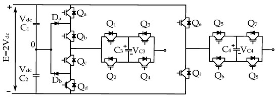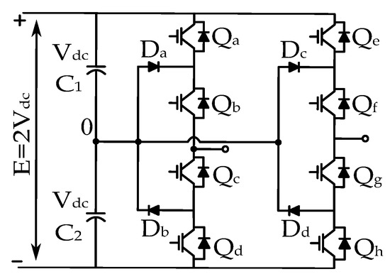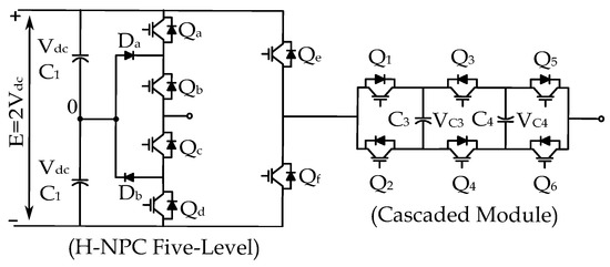 As discussed above, the hybrid NPC with H-bridge configuration will cause a high power loss in the voltage stressed power semiconductor switches because of the high average switching frequency. To overcome the said issues, the dc-link voltage is equally distributed by replacing an H-bridge cell with a five-level cascaded H-bridge (CHB) as shown in Figure 3. However, the topology with a five level CHB arrangement requires an increased number of power semiconductor switches which will cause high conduction losses and require a greater number of drive circuits.