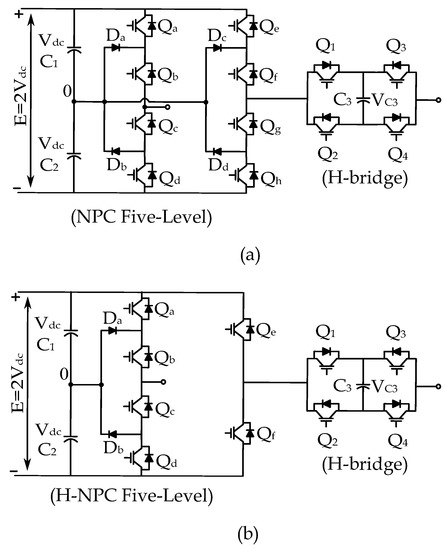 Five level NPC converter with H-bridge (a) NPC with H-bridge module, and (b) H-NPC with H-bridge module.