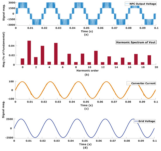 5-L NPC converter topology (a) output voltage, (b) harmonic spectrum of output voltage, (c) converter current, and (d) grid voltage.