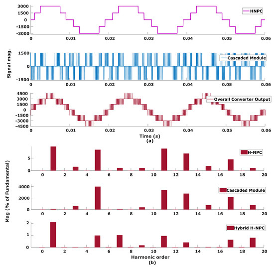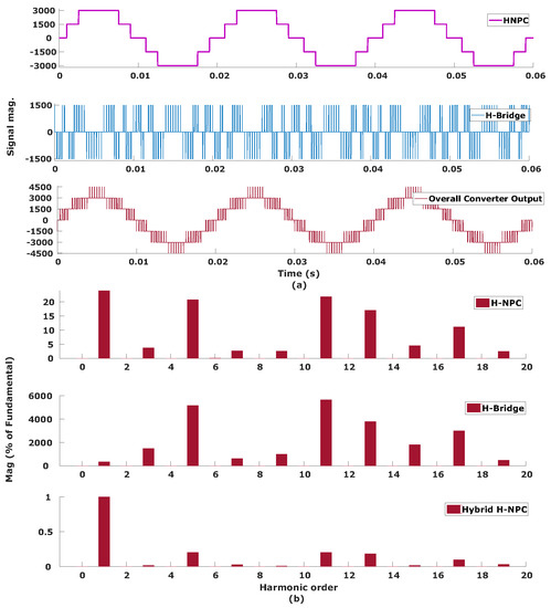 7-L hybrid H-NPC with a cascaded converter topology (a) output voltage, and (b) harmonic spectrum of output voltage.