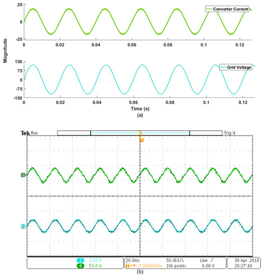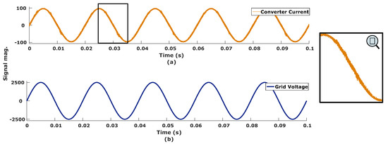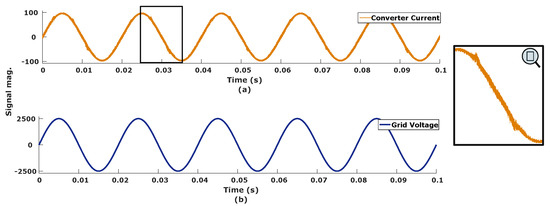 Converter operating in rectifier mode (a) converter current, and (b) grid voltage.