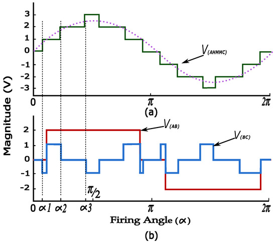 In the proposed AHMMC converter, the H-bridge cell will provide a fundamental support whereas the FCCM module will cancel harmonics produced by the H-bridge cell. The overall output voltage level of the proposed AHMMC converter depends on the modulation index (m) which is expressed by Equation (8). Where is the initial phase angle of the h-bridge cell which is calculated using Equation (9).